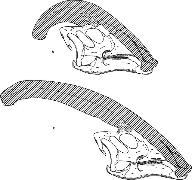 Diagram comparing the narial crests of Parasaurolophus cyrtocristatus (a) and Parasaurolophus walkeri (b).