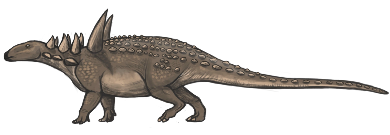 It was a medium-sized nodosaurid, measuring about 5 meters (16.5 feet) long. Sauropelta had a distinctively long tail which made up about half of its body length. Although its body was smaller than a modern black rhinoceros, Sauropelta was about the same mass, weighing in at about 1,500 kilograms (3,300 lbs). The extra weight was largely due to its extensive bony body armour, including the characteristically large spines projecting from its neck.